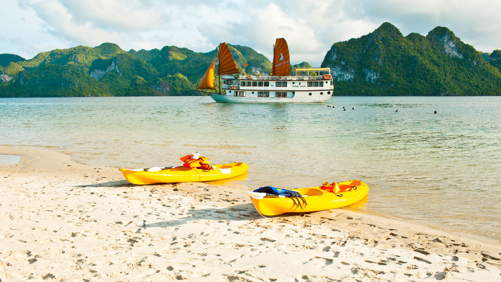 PM: Prepare for a fun kayaking experience in this area while absorbing the stunning vista of the serene bay. Experience a short tender ride from the middle of the bay to Ti Top island where you can relax on the beach or walk up to the top of the island for the panoramic view of the anchorage area. Return to the Halong Phoenix Cruiser, as the sun sets over the bay and relax on the sundeck with your favorite drink. Dinner is served with delicious local seafood.